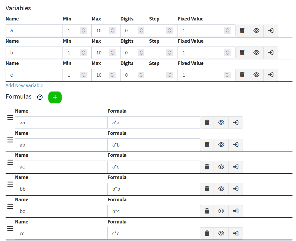 Formulas are written in a table. Formulas can be used as variables in other formulas, but only if that formula is defined above it in the table. Formulas can be reordered by dragging the bars icon on the left side of the row.