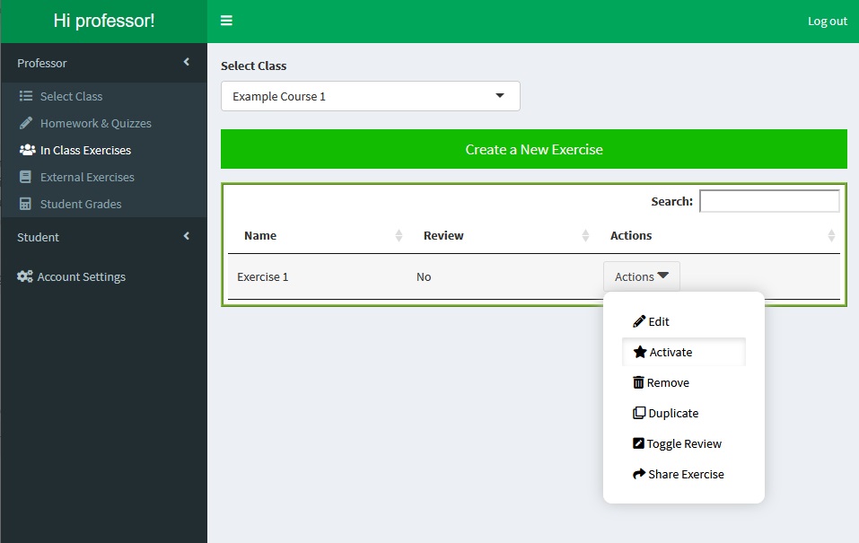 From the Dashboard, an exercise can be activated by navigating to the In Class Exercises tab and selecting the Activate action.