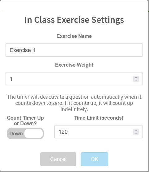 Before activating the exercise, the settings can be changed by clicking Settings → More Settings to open the In Class Exercise Settings Alert.
