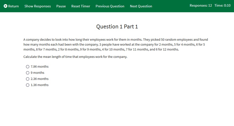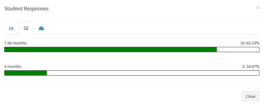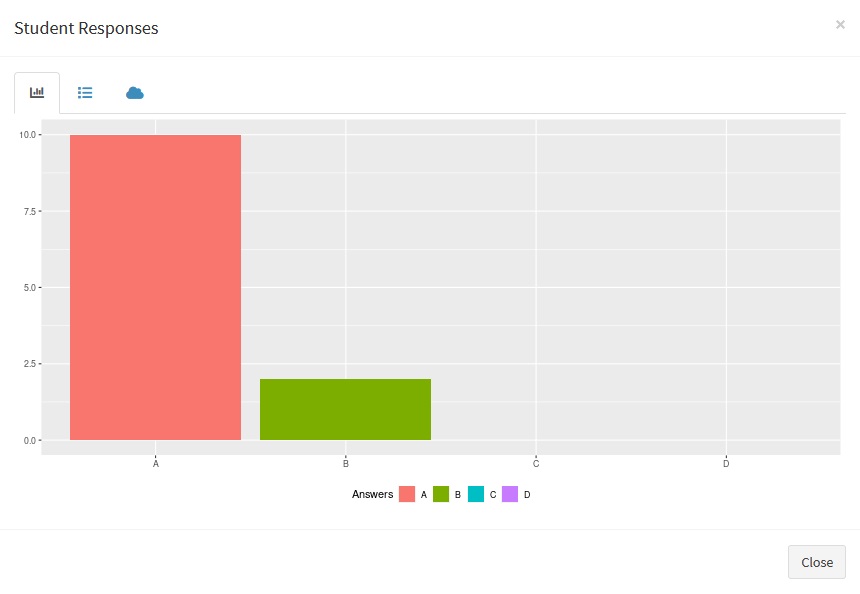 By clicking the Show Responses button, you can visualize the answers to the active question. They can be displayed in three ways:
