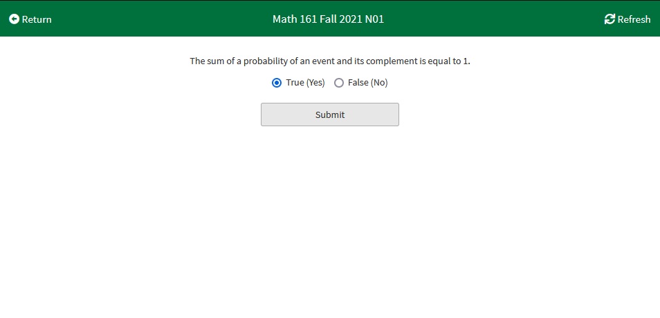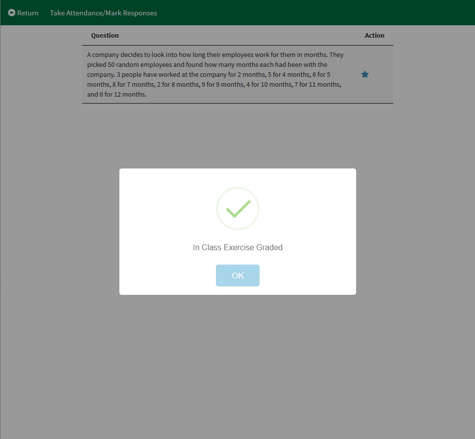 Once your In Class Exercise is complete, you can press Return to go back to the Exercise Select Question page. From there, press the Take Attendance/Mark Response button. This will take attendance for the exercise and mark all of the answers. If a student has given at least one answer, then they will be considered as having attended the class.