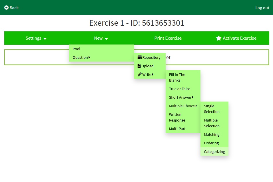 The answers in this question type belong to categories that are written in the Categories table. A Categorizing question can have any number of categories. Each category can have a limit to how many answers fit in it. To have the category be unlimited, leave the limit input blank.