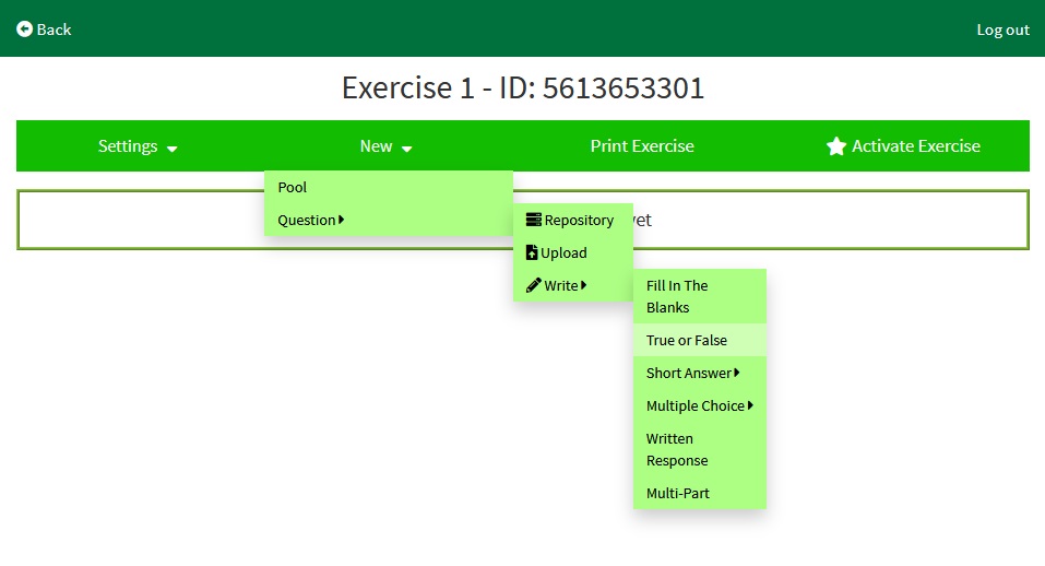 The True or False question does not have any settings. The Correct answer can either be True (Yes) or False (No).