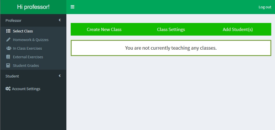 When you first log in to your account, the first thing to do is create your first course. You can do so in the “Select Class” tab by clicking the “Create New Class" button.