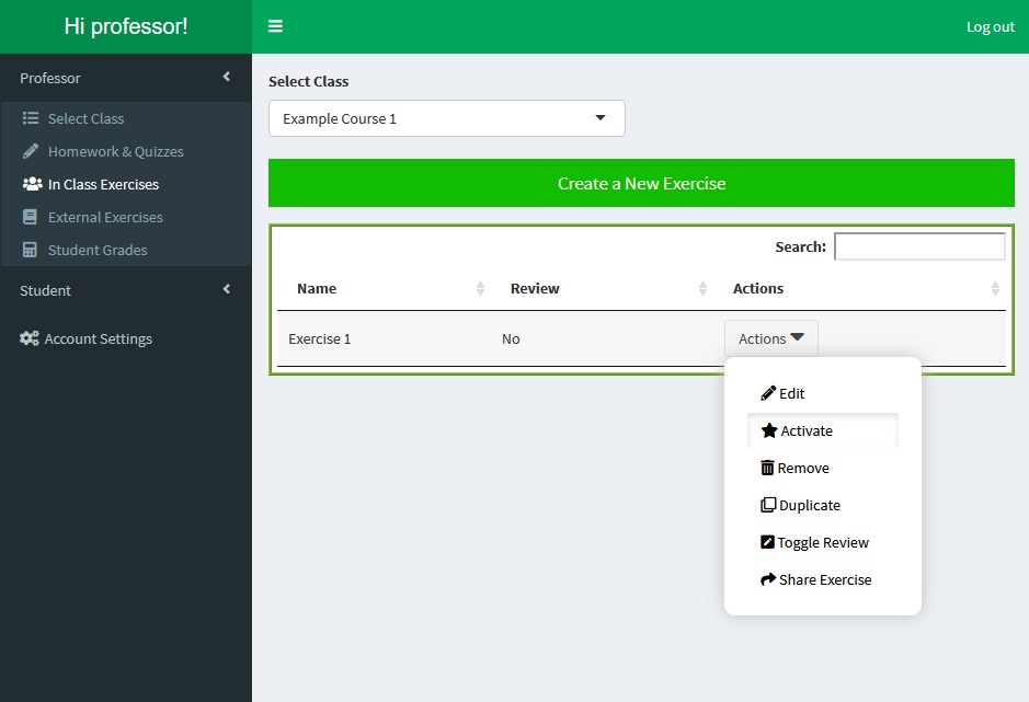 In the “In Class Exercises” tab, press the “Create a New Exercise” button.