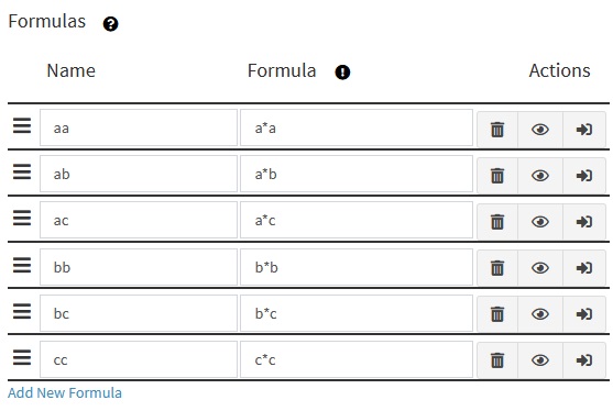The table's contents be inputs, where the student enters the product of the variable in the row and column of the input. There are 9 inputs that will be added, but there are only 6 unique products. Create 6 formulas to calculate the correct answers.