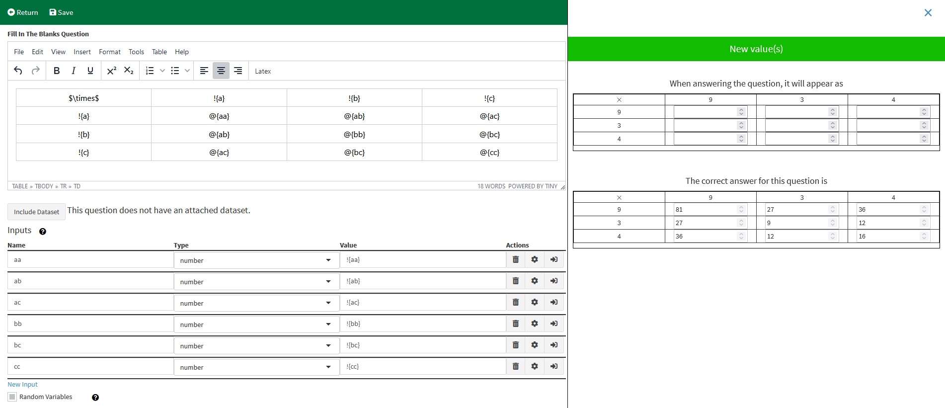 The next example will create a multiplication table in the Question editor for students to fill in. From the Edit page, create a new Fill in the Blanks question by clicking New → Question → Write → Fill In The Blanks