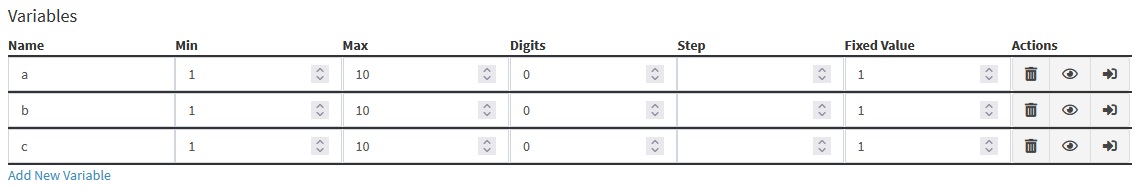 Go to the Variables table and create three variables, called “a”, “b”, and “c”, each with a Min of 100, a Max of 999, and Digits of 0. All three will be three digit random integers that can differ from each other.