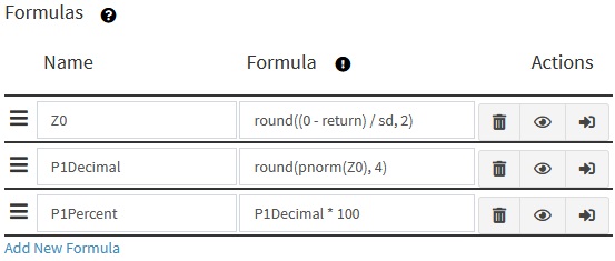 The first formula will be named Z0, and will calculate the Z score for 0. In the formula column, enter “round((0 - return) / sd, 2)”. round is an R function, It will round the first argument, to the number of digits specified in the second argument, or to the nearest integer, if no digits are specified. For more information on the function, click the exclamation mark button next to the “Formula” column header, and search for the function “round”. round is in the “Math” function group in the documentation.