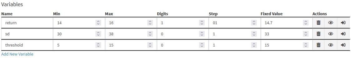 The second variable will represent the standard deviation of that return. In this example, it will be given the name “sd”, a Min of 30, a max of 38, a Digits of 0, a Step of 1, and a Fixed Value of 33, to represent the original value.