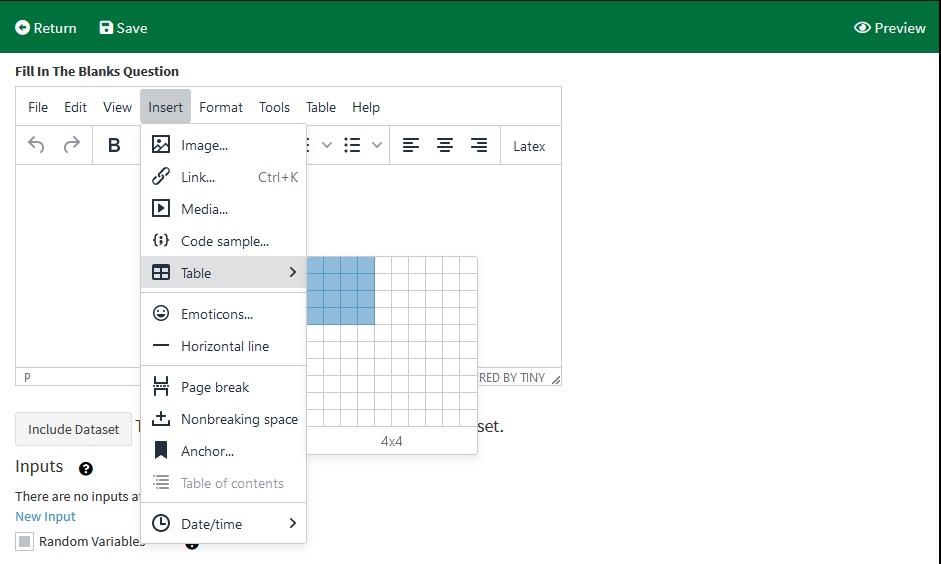 Create a table in the Fill In The Blanks Question Input by clicking Insert → Table → 4x4 or Table → Table → 4x4. This will create a table with 4 rows and 4 columns.